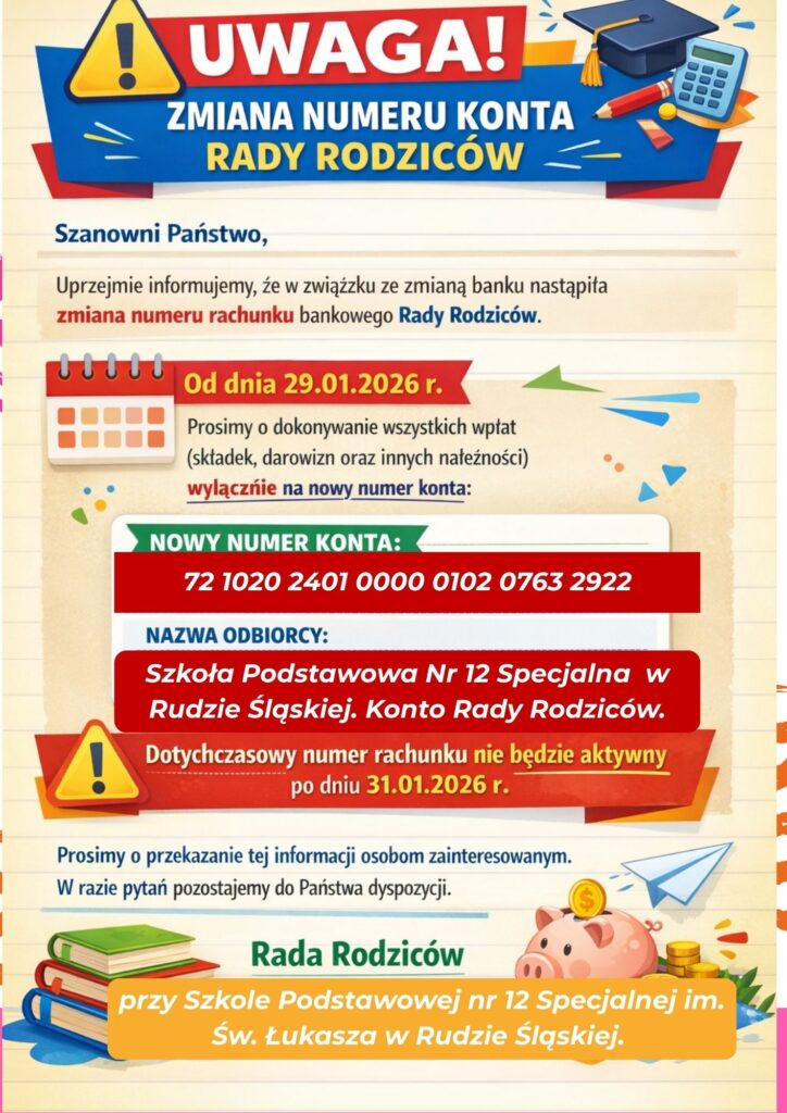 Prosimy przy wpłacaniu wpisywać tytułem: Imię i Nazwisko dziecka, klasa oraz wpłata na radę rodziców.